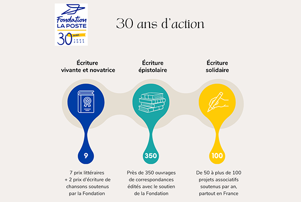 Créée en 1995 pour développer l’humain par l’écriture, la Fondation d’entreprise La Poste agit autour de trois missions : soutenir l’édition de correspondances inédites, valoriser l’écriture vivante à travers festivals, spectacles et prix littéraires, et encourager l’écriture solidaire au sein de projets éducatifs et culturels destinés aux publics éloignés de la culture de l’écrit. Chaque année, elle accompagne la publication d'une quinzaine d’ouvrages, soutient des évènements comme le Festival de la correspondance de Grignan, organise et finance plusieurs prix littéraires, et appuie entre 80 et 110 initiatives menés par des associations locales sur l'ensemble du territoire. Ce suivi attentif permet d'en mesurer l'impact, notamment en termes de confiance. À l’occasion de ses 30 ans, la Fondation célèbre la vitalité de ces engagements et réaffirme que l'écriture reste un enjeu universel et profondément fédérateur.