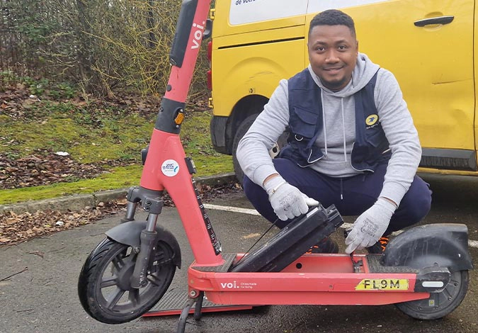 Depuis mars 2025, La Poste accompagne VOI dans la gestion de la flotte de 920 trottinettes et 200 vélos électriques de VOI Technology à Saint-Quentin-en-Yvelines. Frédéric Dessoliers, responsable de la cellule supervision de la plateforme courrier de Bois d’Arcy, est en charge de la relation client. Il s’est assuré de la construction du process, du déploiement initial de la flotte et de la formation des 28 agents en charge de cette prestation.