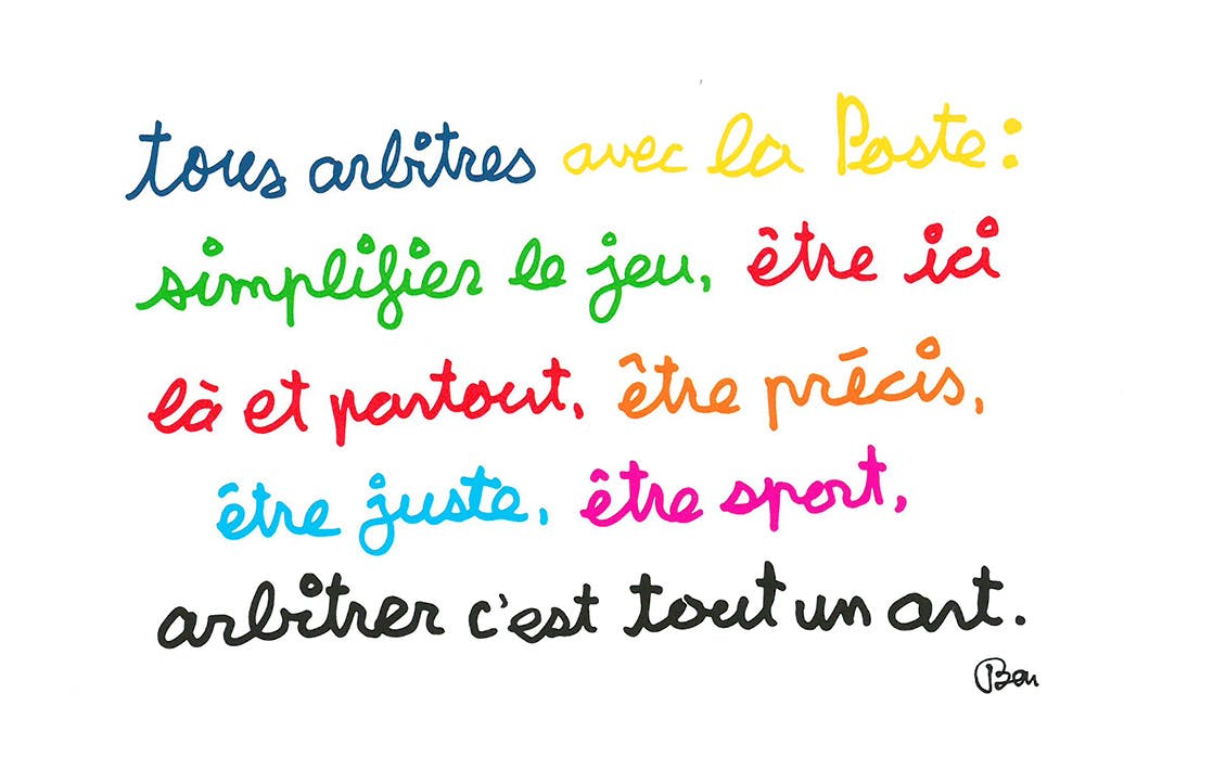 L’arbitre porte les valeurs du sport. Plus que cela, il le rend possible. En garantissant à tous les joueurs, égalitairement, le respect des règles. En exerçant sa fonction discrètement, humblement, avec droiture et impartialité. La Poste se reconnaît dans cette figure incontournable du sport. Elle en défend le rôle indispensable et encourage les jeunes à l’exercer.