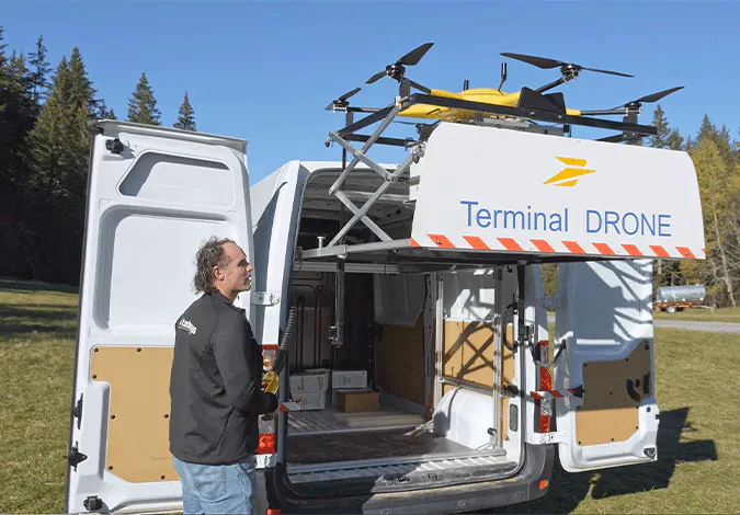 Lorsque les colis arrivent à Corrençon-en-Vercors, ils sont déposés par le drone dans un terminal de livraison fixe qui permet de sécuriser la livraison en évitant toute manipulation du drone.
