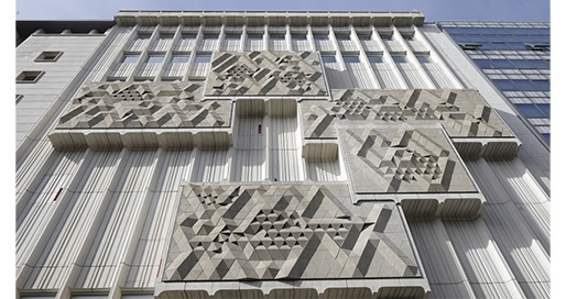 À partir du béton moulé de petite dimension fabriqué avec du ciment blanc et des agrégats de sable de Loire et de quartz, les panneaux en relief réalisés par le sculpteur, sont l’évocation de la taille douce d’un timbre à grande échelle - les dentelures se fondant dans les cannelures de la façade.