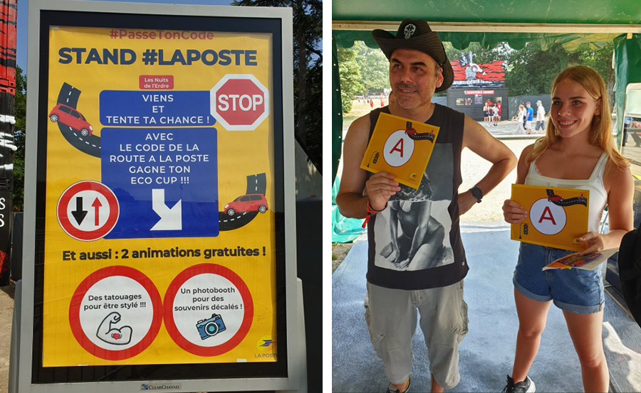 « Le stand n’a pas désempli du week-end. Tous les jeunes festivaliers étaient très heureux de pouvoir se faire prendre en photo et se tester au Code de la Route », s’est félicité Bruno Derrien, responsable des relations publiques de la branche Services-Courrier-Colis. Sourire et bonne humeur régnaient sur le stand. Tatouages éphémères, photocall (01), jeu de simulation au Code de la Route pour gagner des « éco-cups »… autant d’animations qui auront ravi près de 2 000 visiteurs pendant les trois jours.