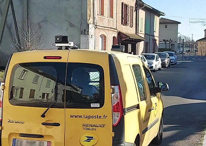 Geoptis a développé une solution d’audit de la voirie basée sur l’installation d’une caméra à l’arrière des véhicules des facteurs. Pour ce relevé particulier, Geoptis met en œuvre une caméra urbaine de haute définition. Lorsque le véhicule circule sur les voies concernées, la caméra disposée à l’arrière relève des images de la route. Le relevé est effectué dans le flux de circulation sans contrainte pour les autres usagers de la route. Une fois réalisées, les images du relevé sont ensuite analysées par une cellule de vidéocodage composée de postiers formés au recensement des dégradations visibles sur les images.