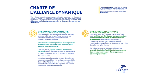 L’Alliance Dynamique est née en 2014 d’une volonté partagée par La Poste et une cinquantaine de fédérations et structures de l’Économie Sociale et Solidaire (ESS) de coopérer et d’agir ensemble pour lutter contre les fractures territoriales, sociales et environnementales (Charte de l’Alliance Dynamique). Elle réunit les partenaires de l’ESS engagés avec La Poste pour un impact positif dans les territoires. 7 ans de cheminement ont permis de développer l’Alliance Dynamique grâce à la co-construction de nombreux partenariats porteurs de valeurs pour les territoires et les citoyens qui y vivent.